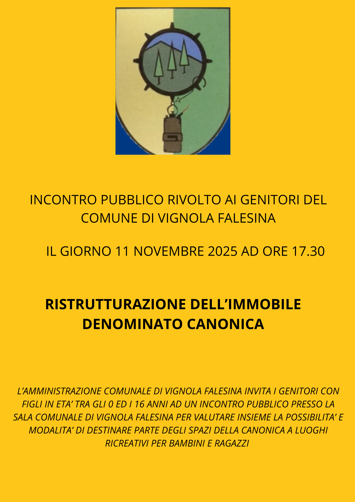 L'amministrazione comunale di Vignola Falesina invita i genitori con figli di età compresa tra i 0 (zero) ed i 16 anni, ad un incontro pubblico presso la sala comunale di Vignola Falesina per valutare insieme la possibilità e modalità di destinare parte degli spazi della canonica a luoghi ricreativi per bambini e ragazzi.